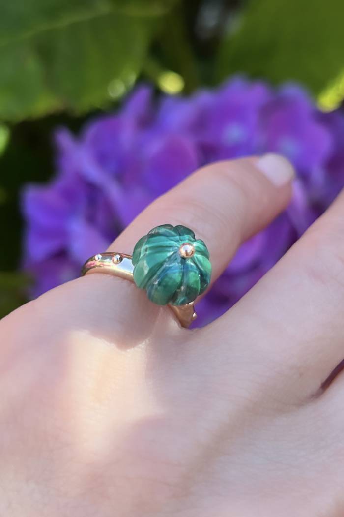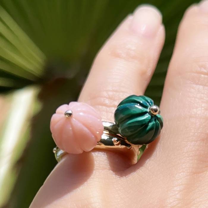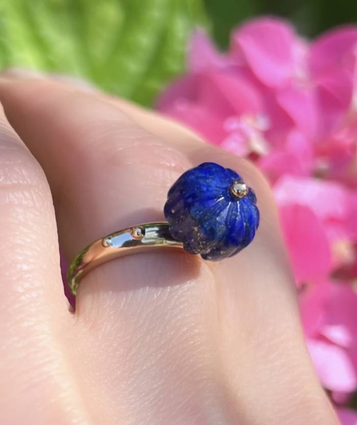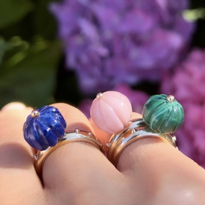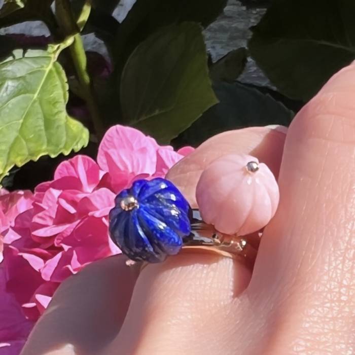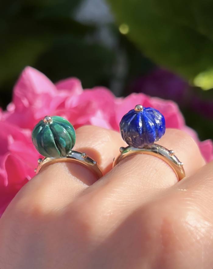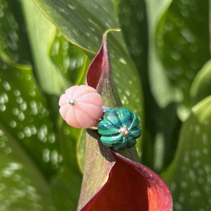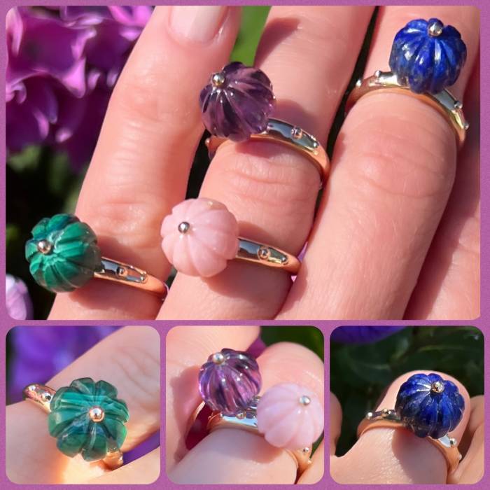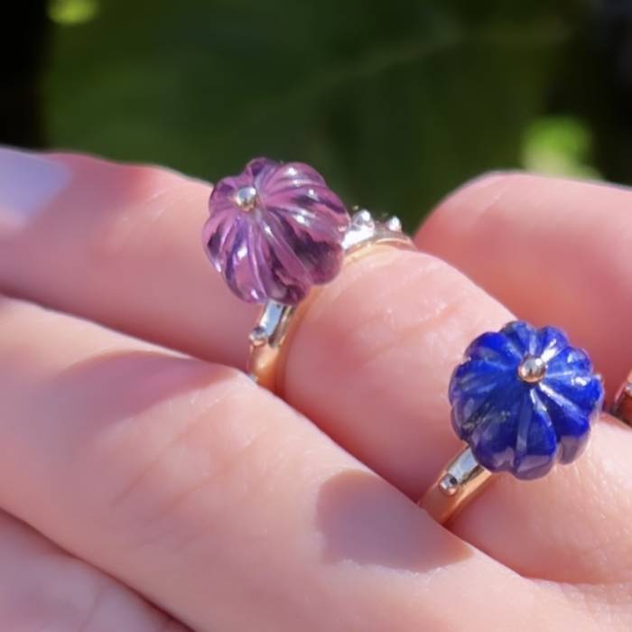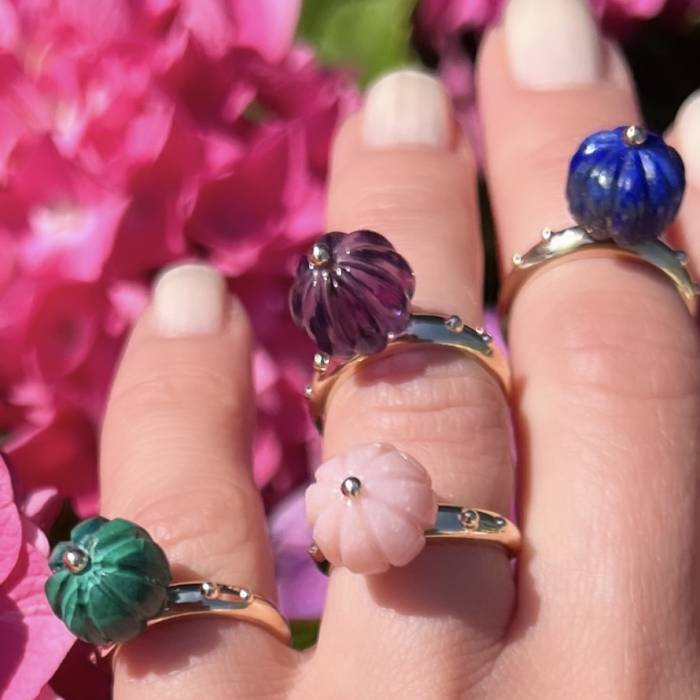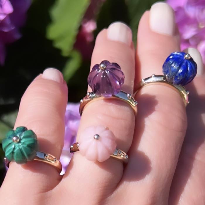 This radiant Dieva Flower Collection features rings crafted from precious gold and adorned with natural gemstones, meticulously hand-carved by skilled artisans into delicate flower shapes. Discover the vibrant beauty of malachite, lapis lazuli, amethyst, and pink opal, each stone bringing a unique energy and charm. With limitless possibilities, you can create your own piece by selecting between 18k or 9k gold and your favourite gemstone, making every ring or earring as unique as you are.