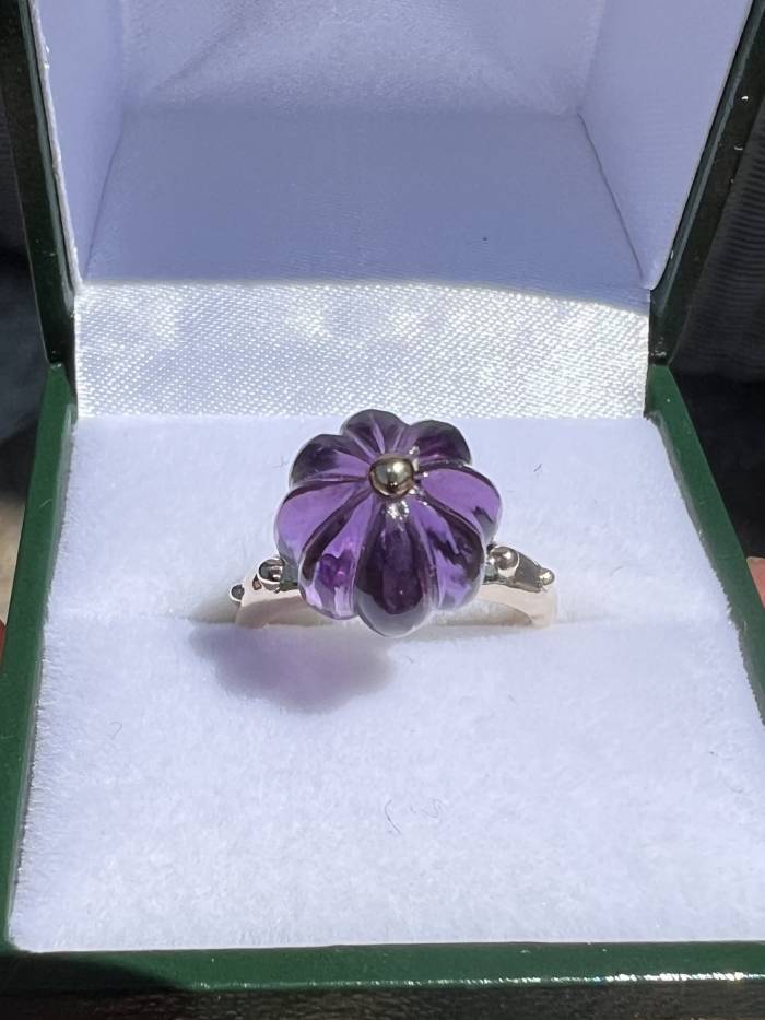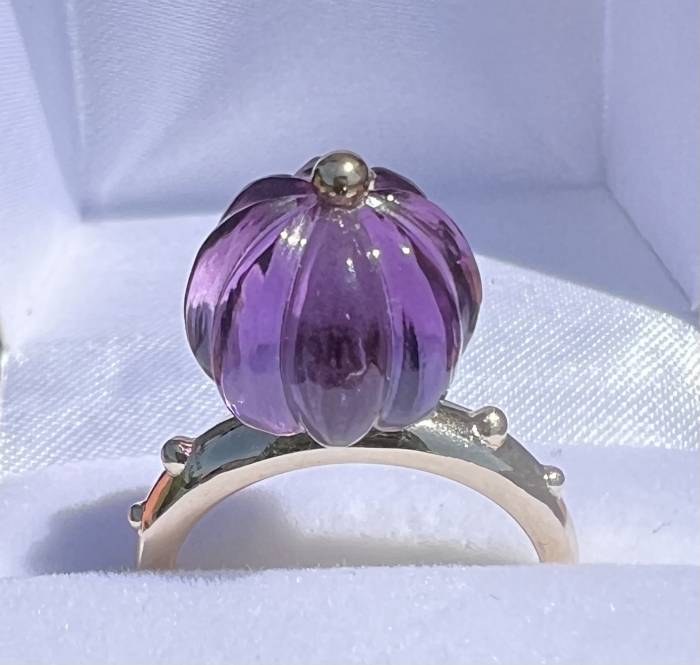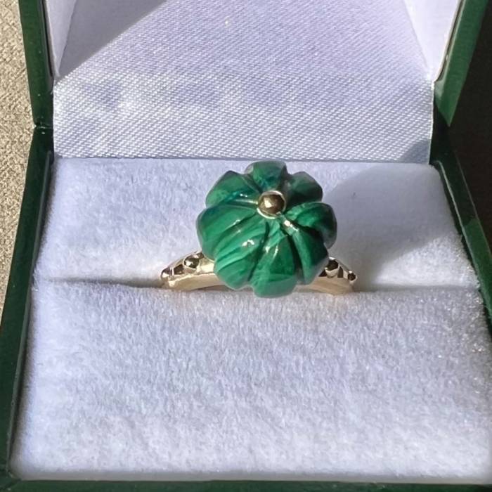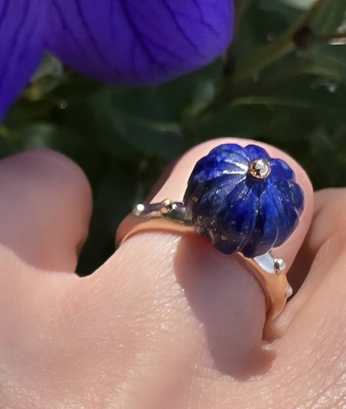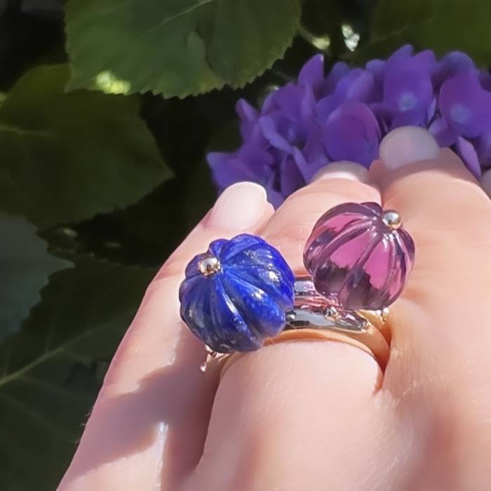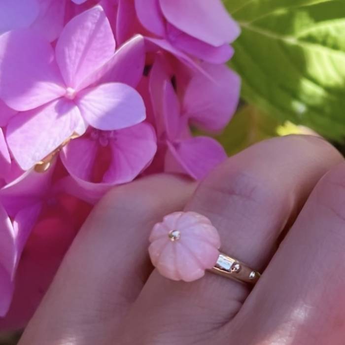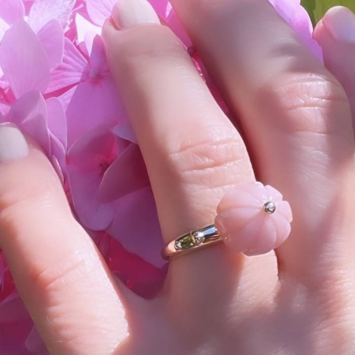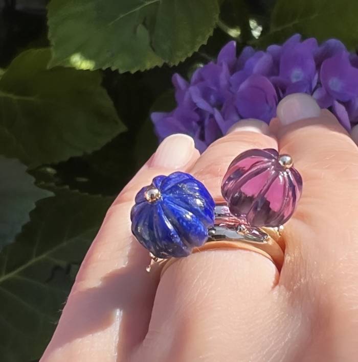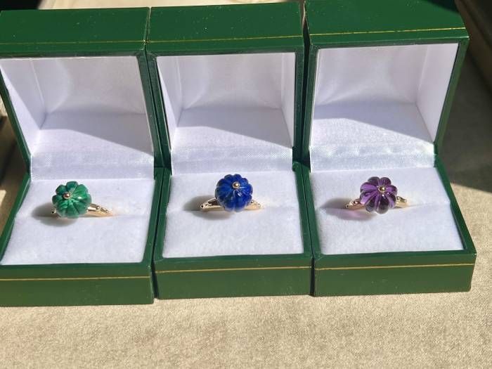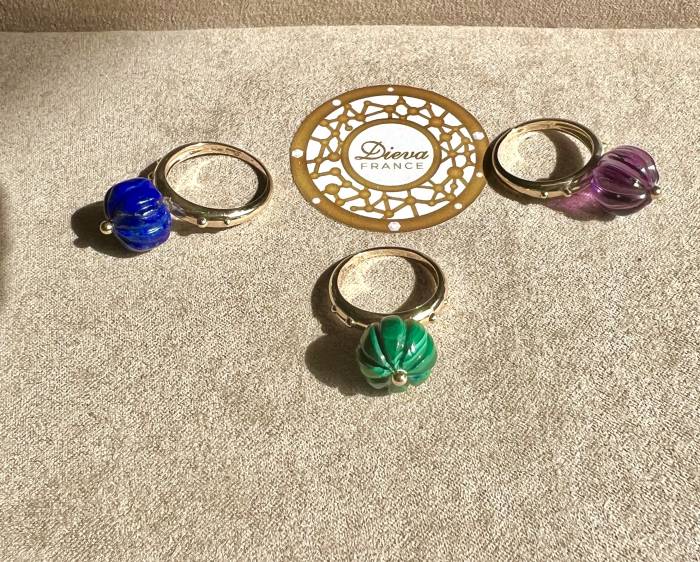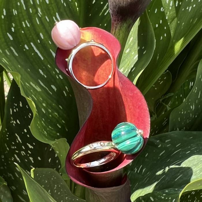 This radiant Dieva Flower Collection features rings crafted from precious gold and adorned with natural gemstones, meticulously hand-carved by skilled artisans into delicate flower shapes. Discover the vibrant beauty of malachite, lapis lazuli, amethyst, and pink opal, each stone bringing a unique energy and charm. With limitless possibilities, you can create your own piece by selecting between 18k or 9k gold and your favourite gemstone, making every ring or earring as unique as you are.